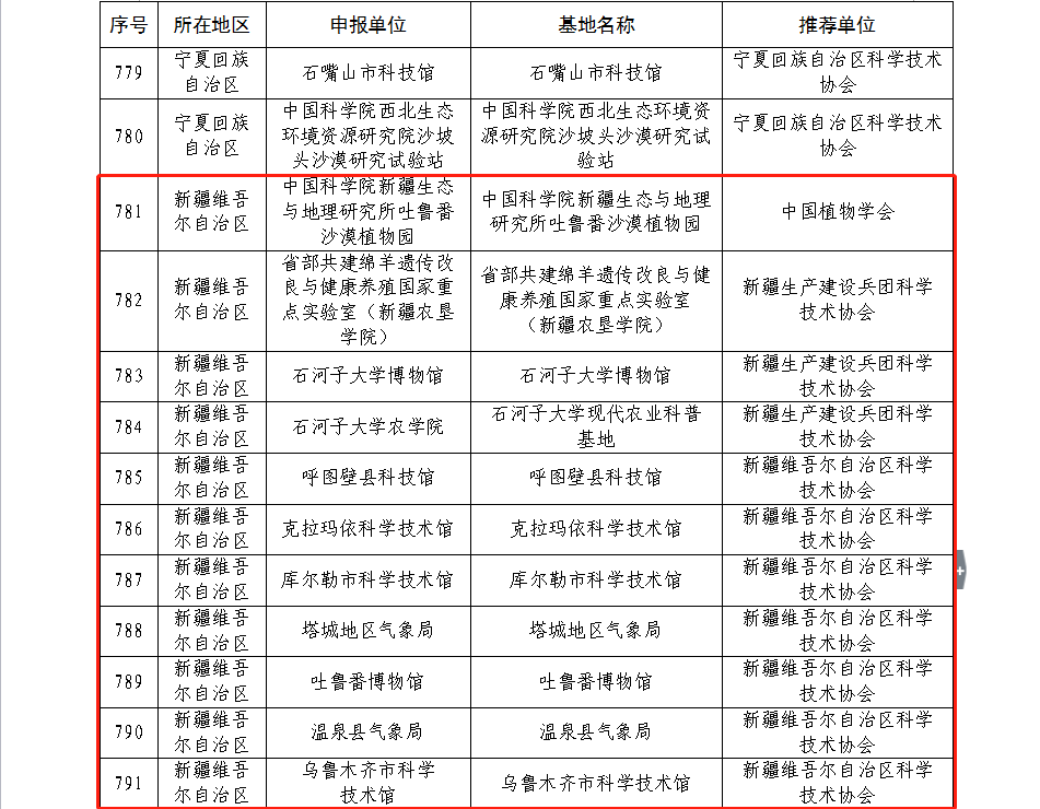 近日,中國科協辦公廳發布《關于2021-2025年全國科普教育基地第一批認定名單的公示》,經評審,800家單位擬認定為全國科普教育基地,新疆共有18家單位入選。