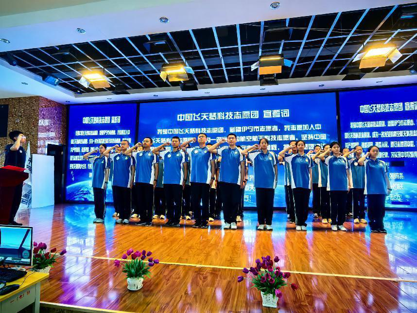 活動中,中國飛天夢科技志愿團向伊寧市支隊授旗,30名志愿者代表上臺宣誓,加入中國飛天夢科技志愿團。